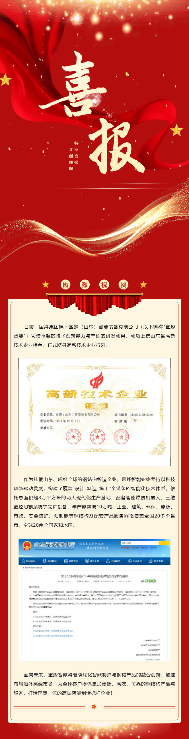 頭條 | 喜報(bào)!蜜蜂(山東)智能裝備有限公司榮獲“高新技術(shù)企業(yè)”稱號!