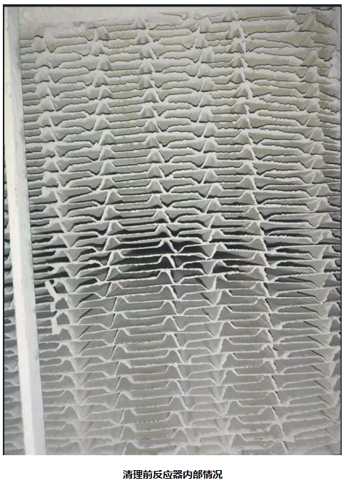 本次投運的兩個項目,采用水泥窯專用的板式催化劑,具有抗堵塞、吹掃頻率低、運行費用低的特點。以下為雙良鼎新水泥SCR脫硝工程投運2個月時,清理前的板式催化劑內部照片。