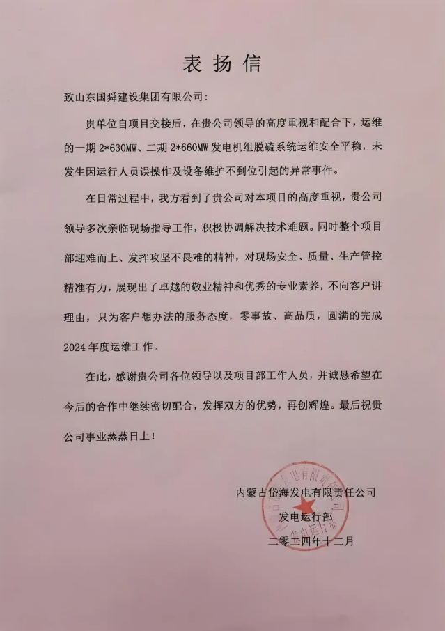 近日,山東國舜岱海運維項目團隊榮獲內蒙古岱海發電有限責任公司頒發的“安全生產運營先進單位”榮譽牌匾、錦旗和表揚信,體現出客戶對項目團隊工作的充分認可和高度贊揚。 內蒙古岱海發電有限責任公司一期2×630MW、二期2×660MW燃煤發電機組脫硫系統采用石灰石-石膏濕法工藝,可以在0-100%BMCR工作容量范圍內長期安全穩定運行,系統出口二氧化硫、氮氧化物、煙塵排放濃度遠低于35mg/Nm3、50mg/Nm3、10mg/Nm3超低排放限值,該項目有力推動了岱海發電的綠色發展,對于國舜實現發電領域業務新拓展具有重要意義。 山東國舜岱海運維項目團隊將以此為契機,錨定“快速響應客戶需求,實現可持續發展”的發展目標,繼續堅持“精準、經濟、精致”的管理理念,以更加專業的技能、更加優質的服務和更加飽滿的熱情,書寫攜手奮進、共生共贏嶄新篇章!